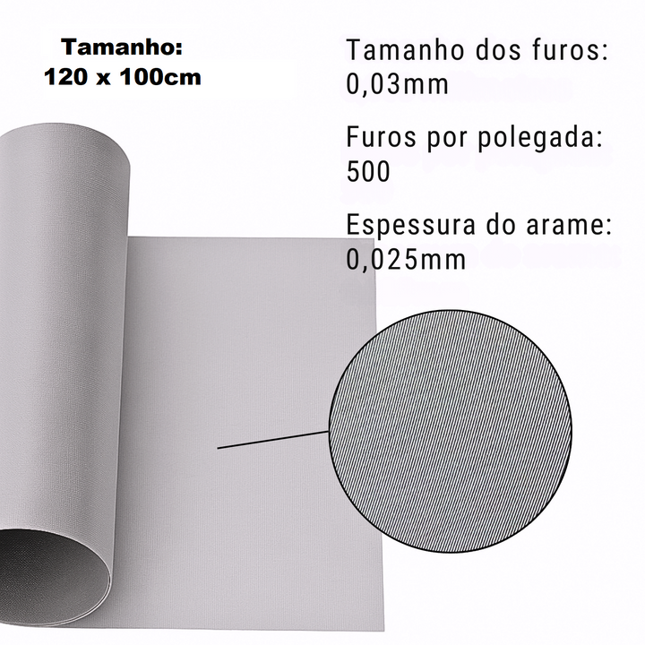 - Abertura da malha (tamanho dos furos): 0,03 milímetros