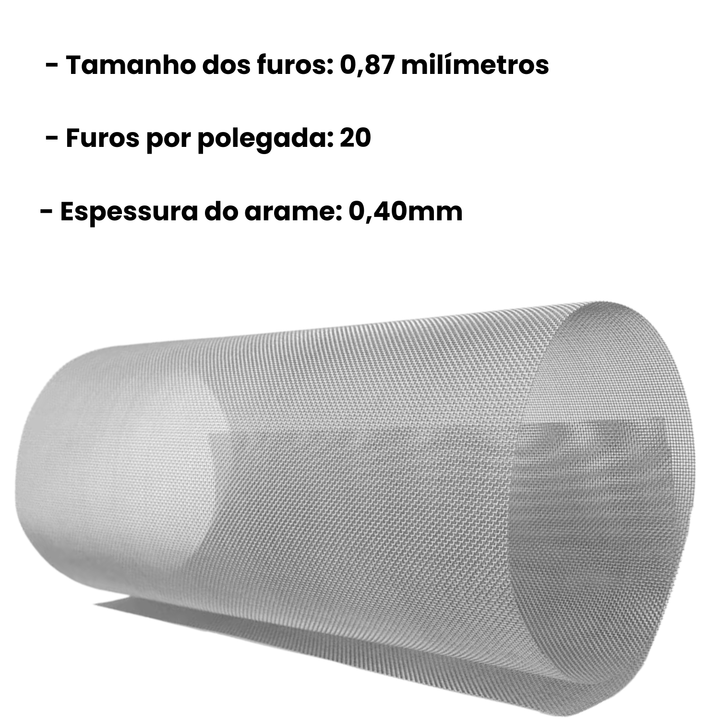 - Abertura da malha (tamanho dos furos): 0,87 milímetros