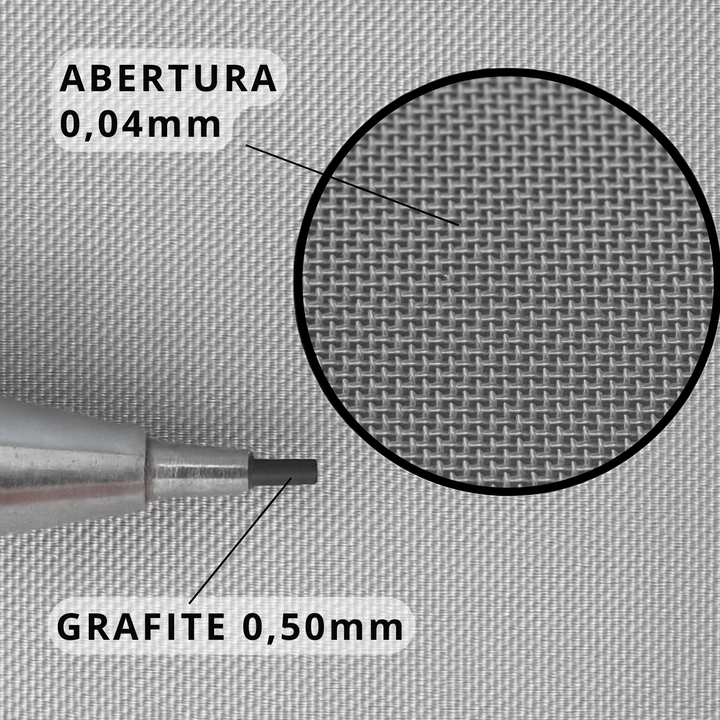 - Abertura da malha (tamanho dos furos): 0,04 milímetros