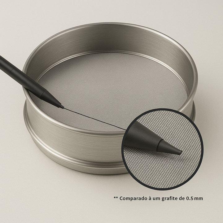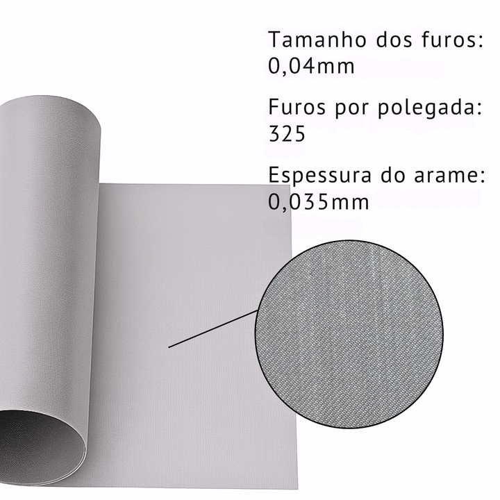 - Abertura da malha (tamanho dos furos): 0,04 milímetros