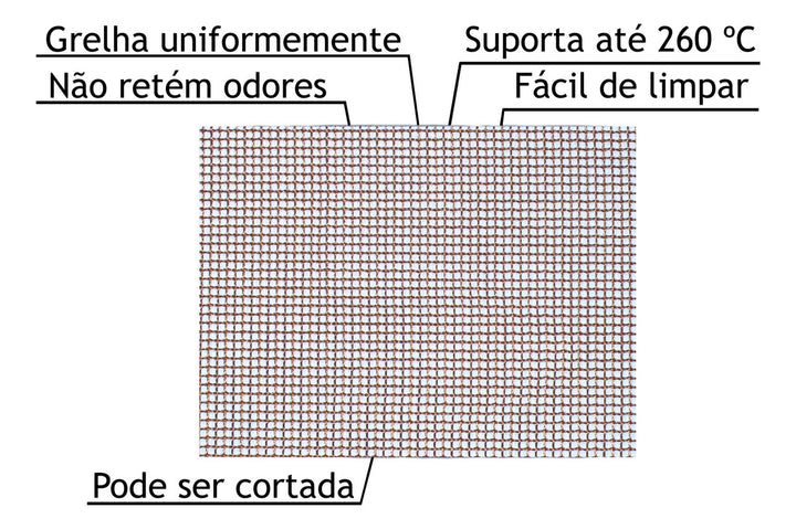 Nossa tela antiaderente é produzida com fios de fibra de vidro e revestida com teflon, essa tela impede que os alimentos caiam no fogo ou grudem na grelha metálica.
